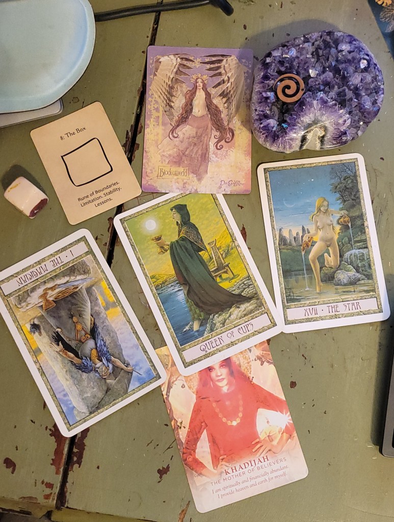 I pull two cards for overriding themes:  the Box from Womanrunes Molly Remer and Shekhinah Mountainwater.  Is it confinement or stability and boundaries?  I know the answer to that.