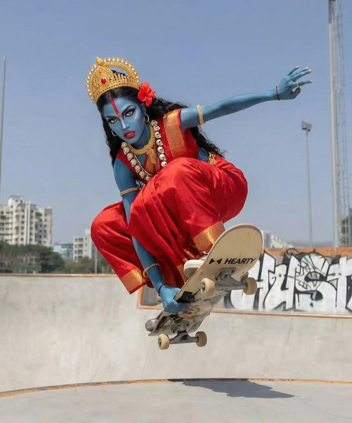 Kali’s iconography is both formidable and contradictory. She is described as the force that disrupts a corrupt society, destroys ignorance and sin, and opens the path for new beginnings, blessing those who seek knowledge. Kali is seen as the mother who gives life—the Creator—and then takes it away—the Annihilator. She rules over both birth and death, embodying the cycle of creation and destruction.”