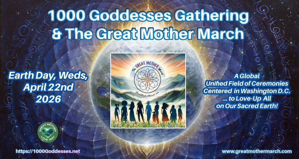 And… if you want to be marked as a Luminous Love Node in the Global Grid of people linking in spiritually that day … in support of a Unified Field of Great Mother Love supporting the final ceremony of the Great Mother March … plus amplifying Great Mother Love globally you can register at: https://1000Goddesses.net – Mare Cromwell